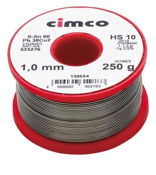 Elektroniklot nach DIN EN 29453, mit aktiviertem Harz-Flussmittel, nicht korrosiv auf NE-Metallen, schnell fließend, Flussmittel nach DIN EN 29454-1 .1.2B2,5% (Gew. %2,5±0,5) S-Sn60Pb38Cu2, auf Einwegspulen Draht-Ø 3,0 mm; Gewicht: 250 g.