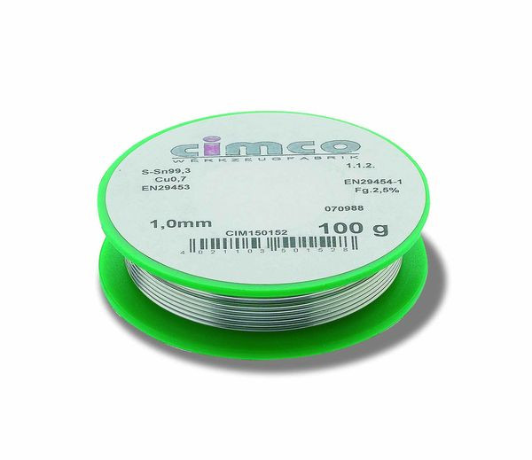 Elektroniklot bleifrei nach DIN 29453, S-Sn 99,3 Cu 0,7, mit aktivem Harz-Flußmittel, nicht korrosiv auf NE-Metallen, Flussmittel nach DIN EN 29454-1 1.1.2 B 2,5% (Gewicht % 2, 5± 0,5), auf Einwegspulen. Draht-Ø 1,0 mm; Gewicht: 100 g.