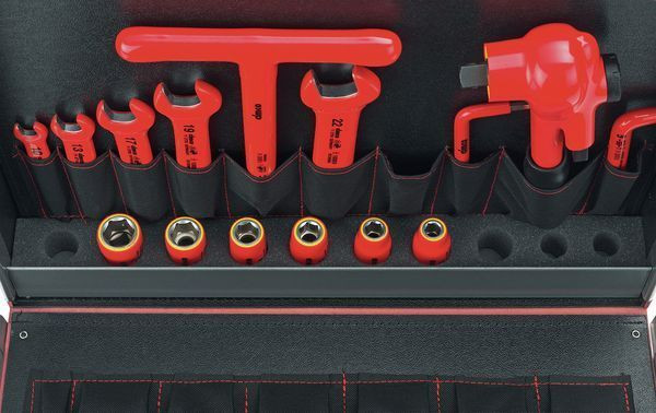 VDE-Werkzeugtasche aus Rindleder, doppelt vernäht. Aluminiumkanten zur Kofferstabilisierung, speziell für Sicherheitswerkzeuge und Schutzvorrichtungen, alle Außenkanten sind mit Alu-Winkeln verstärkt, sowie sind die Seitenteile, Vorder- und Rückwand, Boden und Deckel extra verstärkt. Die Vorder- und Rückwand sind in einem 90° Winkel aufklappbar. Abschließbare Steckschlösser, Seitenverschlüsse, schwerer Stollen-Tragegriff, zahlreiche Werkzeugeinsteckfächer, Dokumentenfach, seitliche Schlaufen für Schultertrageriemen, Bodengleiter, Schaumstoffeinlage mit Aussparungen für Steckschlüsseleinsätze. Besonders sichere Aufbewahrung von Elektrikerschutzhandschuhen durch verstärkte Trennwände im Mittelteil. Koffer leer, mit einem Gewicht von 5.300 g. Außenmaß: B/T/H: 480/220/380 mm; Innenmaß B/T/H1/H2/H: 325/445/60/65/60/200 mm.