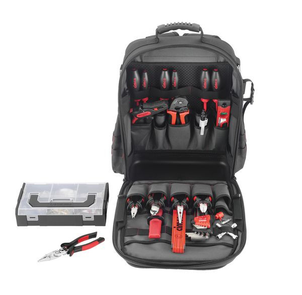 Werkzeug-Rucksack Ergo-XL30 mit außen fixierter L-BOXX Mini. Geräumige Aufteilung mit 30 l Ladevolumen und 90 Möglichkeiten zum Klemmen, Stecken und Aufbewahren. Vier separate Reißverschlussfächer zum Schutz höherwertiger Werkzeuge oder Messgeräte, inklusive separat gepolstertem Laptopfach. Innenliegende Fächer für zusätzliche Aufbewahrung von Tablet und Dokumenten. Zwei offene Seitentaschen mit Gummizug bieten schnellen Zugriff auf Werkzeuge oder Trinkflasche. Molle-Bänder bieten flexible Befestigung für entsprechendes System-Zubehör. Ergonomisch dank starker Rückenpolsterung und verstellbarer Trage- und Brustgurte bei nur 2,8 kg Leergewicht. Kofferlasche für einfache Befestigung auf Trolley-Koffern. Stabile, wasserdichte Bodenschale für hohe Standfestigkeit. Reflektierendes Logo für erhöhte Sichtbarkeit. Abmessungen: H480 x B380 x T220 mm. Gewicht 5,9 kg. Maximale Zuladung 14 kg. Bestückung: 117762 VDE-Schlitzschraubendreher SLIM 3,5x100, 117768 VDE-Schlitzschraubendreher SLIM 5,5x125, 117750 1000V Schraubendreher-Satz mit Kombi-Profil PZ FL1 und PZ FL2, 101950 Presszange FLEXI-CRIMP 6, 112894 Universal-Schaltschrankschlüssel, 100574 VDE 1000V Seitenschneider 160mm, 100216 VDE 1000V Telefonzangen 200 mm mit geraden Backen, 100352 Schraubenzange 160 mm, 110604 Sechskant-Stiftschlüssel-Satz 9-teilig, 211540 Schaltschrank-Wasserwaage 230mm, 210004 Gliedermaßstab 2m Holz, 100776 PRO-STRIP 16, 120108 VDE-Kabelschere DUOCUT, 213150 CIMCO Baumarker Graphit. Zusätzlich mit 438010 CIMCO L-Boxx Mini inklusive isolierten Aderendhülsen (je 100er): 187004 grau 0,75mm² / 8mm, 187008 rot 1,0mm² / 8mm, 187012 schwarz 1,5mm² / 8mm, 187016 blau 2,5mm² / 8mm, 187022 gelb 6,0mm² / 12mm, 187024 rot 10,0mm² / 12mm