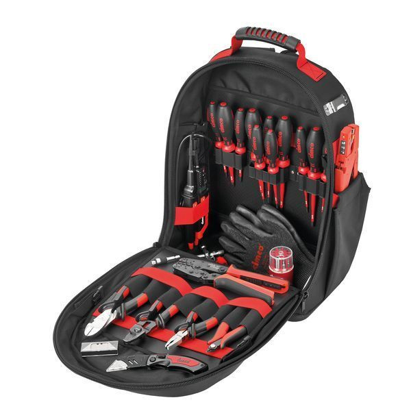 Robuster Werkzeugrucksack aus wetterfestem Material verfügt über Zahlreiche Werkzeugaufnahmen: Taschen, Ösen, D-Ringe und Stecksystem für Handwerkzeuge. Die Schultergurte und der Rücken dieses Rucksacks sind ergonomisch gepolstert und ermöglicht ein komfortables Tragen. Das Riemensystem ermöglich verschiedene Öffnungswinkel. Werkzeugrucksack-Bestückung: 1 x VDE-Kabelschere, für Kabel 18 mm², 1 x 1000 V Kraft-Seitenschneider, 200 mm , 3 x VDE-Schlitz-Schraubendreher SLIM , 2 x VDE-Schraubendreher mit Kombiprofil SLIM , 2 x VDE-Kreuzschlitz-Schraubendreher SLIM , 4 x VDE-TX®-Schraubendreher SLIM, 1 x Elektronik-Seitenschneider ohne Schneidwate, 132 mm , 1 x Universal Schaltschrankschlüssel, 1 x Profi-Schaltschrank-Wasserwaage, 250 mm , 1 x Automatische Abisolierzange für lexible Leiter, 1 x Aderendhülsenpresszange , 1x Telefonzange gebogen, 200 mm , 1 x Schraubenzange, 160 mm