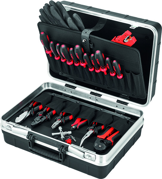 Robuster Werkzeugkoffer Funktion aus stoßfestem Kunststoff mit stabilem Aluminiumrahmen, Zwei robuste, abschließbare Kippschlösser, Bodenschale im Spritzgussverfahren hergestellt mit zahlreichen Unterteilungsmöglichkeiten, Herausnehmbare Bodenabdeckplatte, einseitig mit Werkzeugtaschen bestückt, Herausnehmbare Werkzeugtafel mit Dokumentenfach und einer Vielzahl von Werkzeugeinsteckfächern, Größe: L x B x H: 395 x 455 x 205 mm, Gewicht: leer 3.450 g, Werkzeugkoffer-Bestückung: 1 x VDE-Kabelschere, für Kabel 18 mm², 1 x 1000 V Kraft-Seitenschneider 200 mm, 3 x VDE-Schlitz-Schraubendreher SLIM, 2 x VDE -Schraubendreher mit Kombiprofil SLIM, 2 x VDE-Kreuzschlitz(PZ)-Schraubendreher SLIM, 4 x VDE-innensechsrund-Schraubendreher SLIM, 1 x Elektronik-Seitenschneider ohne Schneidwate 132 mm, 1 x Universal-Schaltschrankschlüssel, 1 x Profi-Schaltschrank-Wasserwaage 250 mm, 1 x Automatische Abisolierzange für flexible Leiter, 1 x Presszange Click`n`Crimp, 1 x Steckschlüssel-Bit-Halter, 1 x Spannungsprüfer 690 V, 1 x Bit-Box, 10-teilig PH/PZ, 1 x Schraubenzange, 160 mm