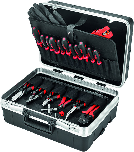 Robuster Werkzeugkoffer mit Trolley Funktion aus stoßfestem Kunststoff mit stabilem Aluminiumrahmen, Zwei robuste, abschließbare Kippschlösser, Bodenschale im Spritzgussverfahren hergestellt mit zahlreichen Unterteilungsmöglichkeiten, Herausnehmbare Bodenabdeckplatte, einseitig mit Werkzeugtaschen bestückt, Herausnehmbare Werkzeugtafel mit Dokumentenfach und einer Vielzahl von Werkzeugeinsteckfächern, Größe: L x B x H: 395 x 455 x 205 mm, Gewicht: leer 3.450 g, Werkzeugkoffer-Bestückung: 1 x VDE-Kabelschere, für Kabel 18 mm², 1 x 1000 V Kraft-Seitenschneider 200 mm, 3 x VDE-Schlitz-Schraubendreher SLIM, 2 x VDE -Schraubendreher mit Kombiprofil SLIM, 2 x VDE-Kreuzschlitz(PZ)-Schraubendreher SLIM, 4 x VDE-innensechsrund-Schraubendreher SLIM, 1 x Elektronik-Seitenschneider ohne Schneidwate 132 mm, 1 x Universal-Schaltschrankschlüssel, 1 x Profi-Schaltschrank-Wasserwaage 250 mm, 1 x Automatische Abisolierzange für flexible Leiter, 1 x Presszange Click`n`Crimp, 1 x Steckschlüssel-Bit-Halter, 1 x Spannungsprüfer 690 V, 1 x Bit-Box Schlitz, 10-teilig PH/PZ, 1 x Schraubenzange, 160 mm