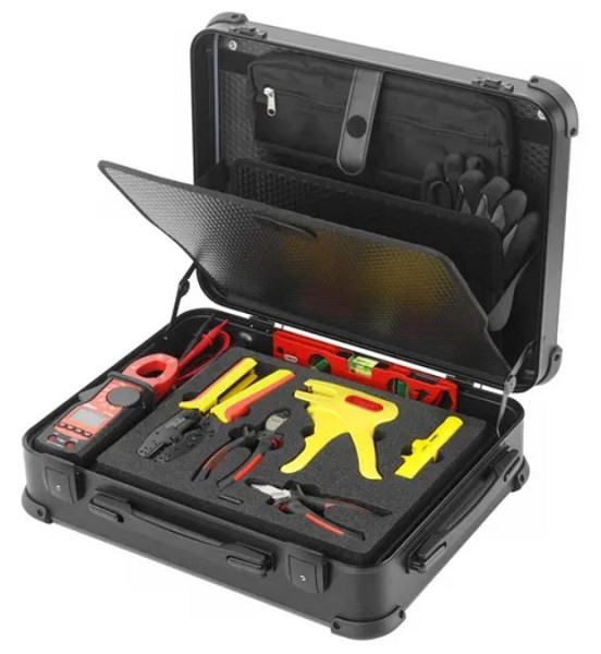 CimPack Solar, Kombination aus Rucksack und Werkzeugkoffer, gefüllt mit den wichtigsten Solar-Werkzeugen, einhändig zu öffnen, robust - ergonomisch - mobil für den täglichen Einsatz, mit Schaumeinlage für die sichere Aufbewahrung, zusätzliches Bodenfach mit variablen Trenneinsätzen für die Integration weiterer Werkzeuge, Laptop-/PC-Fach im Deckel, herausnehmbare Aufbewahrungstasche für Kleinteile oder PC-Zubehör im Deckel per Klett befestigt, Rucksack-Tragesystem aus Cordura®-Gewebe, schmutz- und wasserabweisend, reiß- und abriebfest, entwickelt für langlebigen Einsatz, Trageriemen bei Nichtgebrauch unsichtbar verpackt, Nachhaltigkeitskonzept mit vollständig austauschbaren und recyclebaren Bauteilen, Kofferinhalt 14 Werkzeuge (Crimpzange Click'N'Crimp PV MC4 2,5 - 6 mm², Automatische PV-Abisolierzange 1,5 - 10 mm², Abisolierer PV-Strip 2,5 - 6 mm², 1000 V VDE Kabelschere DUOCUT, 1000 V VDE-Seitenschneider 160 mm, PV-Stromzange 4100 TRMS CATIV/1000V (+Tasche), PV-Clip Kabelbinder 4,6x200 mm (100 St.), 3x Set PV-Stecker m/f, 2x MC4-Entriegelungswerkzeug, Handschuhe Skinny Flex gr. 10, Profi-Schaltschrank-Wasserwaage 250 mm