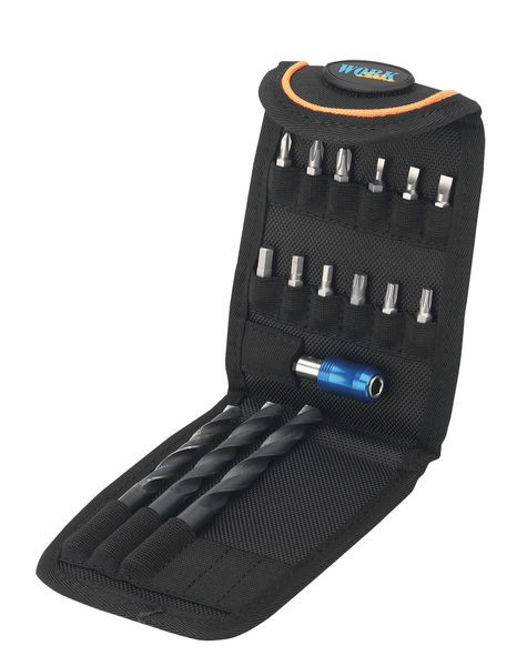 Falttasche für Schraubbits und Zubehör, Aufnahmen für 12 Bits, 5 Bohrer und einen Bithalter, Klettverschluss, Universal-Metall-Halteclip zur Befestigung an Gürteln und Taschen aller Art, Gewicht nur 120 g. Maße 180 x 130 mm