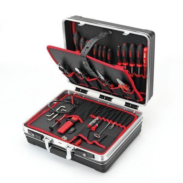 Werkzeugkoffer Klassik "Elektronik" mit Werkzeugsortiment. Werkzeugkoffer-Bestückung je 1x: 1.000 V Telefonzange mit geraden Backen 200 mm, DIN ISO 5745 (10 0216)1.000 V Seitenschneider 16 mm, DIN ISO 5749B (10 0574),Lackabzieher für Drähte ø 0,6 mm (AWG 22) (10 0712), JOKARI Abisolierzange Super 4 (10 0760), Elektronik-Seitenschneider bis 1,3 mm ø, 21°, 132 mm (10 1040), Mikro-Elektronik-Spitzzange, Backen gebogen (10 1076), Pinzette, 120 mm (10 3016), Winkelschraubendreher DIN 5200, für Schlitzschrauben, 100x5,0x 0,65 mm (11 0620), Winkelschraubendreher DIN 5200, für Kreuzschlitzschrauben, PH 1/PH 2x100 mm (11 0630), Festhalte-Schlitz-Schraubendreher isoliert, 4,0x0,8x125 mm (11 0784), Phasenprüfer 120 – 250 V AC, 3,0/65 mm (11 1280), Kontrollspiegel (11 1600), Kombi-Krallengreifer Gesamtlänge 700 mm; (Nutztiefe 600 mm) (11 1650)Präzisions-Schlitz-Schraubendreher, weiß 2,0x0,4x60 mm (11 1864), Sechskant-Steckschlüssel 210 mm, DIN 3125, SW 5,5x125 mm (11 7205), Sechskant-Steckschlüssel 220 mm, DIN 3125, SW 7x125 mm (11 7207), Sechskant-Steckschlüssel 220 mm, DIN 3125, SW 8x125 mm (11 7208), Sechskant-Steckschlüssel 220 mm, DIN 3125, SW 10x125 mm (11 7210)1.000 V Schlitz-Schraubendreher 185 mm, DIN EN 60900, 3,0x0,5 mm (11 7702), 1.000 V Schlitz-Schraubendreher 185 mm, DIN EN 60900, 4,0x0,8 mm (11 7704), 1.000 V Schlitz-Schraubendreher 220 mm, DIN EN 60900, 5,5x1,0 mm (11 7705), 1.000 V Kreuzschlitz-Schraubendreher PH 1, 80 mm, DIN 7438 (11 7731), 1.000 V Kreuzschlitz-Schraubendreher PH 2, 100 mm, DIN 7438 (11 7732), 1.000 V Kreuzschlitz-Schraubendreher PZ 1, 80 mm (11 7741), 1.000 V Kreuzschlitz-Schraubendreher PZ 2, 100 mm (11 7742)Kabelschere DUOCUT, 160 mm mit zweistufigem Schneidenbereich (12 0108), Universalschere 190 mm, Härte HRC 56 bis 58 (12 0122), 1.000 V Sicherheits-Kabelmesser, gerade starke Klinge, 50 mm (12 1042), JOKARI Kabelmesser, 8 – 28 mm ø (12 2016) Gewicht: 7.150 g, B/T/H:487/425/233 mm, Innenmaß B/T/H1/H2/H#: 470/348/125/85/210 mm