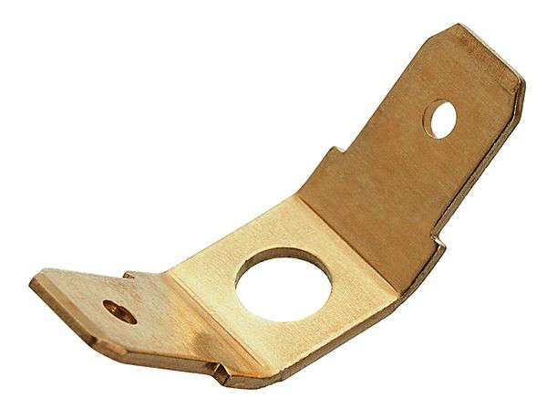 Flachstecker, nicht isoliert. Technische Daten - Werkstoff: Messing, blank; abgewinkelte Ausführung. Ausührung: 2x45°; Steckermaß: 6,3x0,8; Für Bolzen mit einem Ø von M4 mm; Gewicht per 100 St.~kg: 0,15; VE/Stck.: 100.