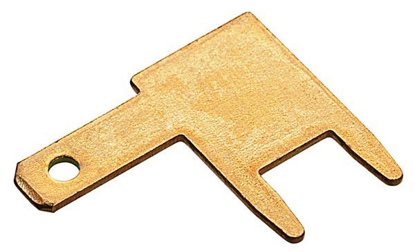 Flachstecker, nicht-isoliert. Technische Daten: Werkstoff: Messing, blank. Zum Einlöten in gedruckte Schaltungen. Gerade Ausführung: gewinkelt 90°; Steckermaß: 2,8x0,5 mm; Rastermaß: 6,3 mm; Länge gesamt: 13,3 mm; Gewicht per 100 St.~kg: 0,025; VE/Stck.: 100