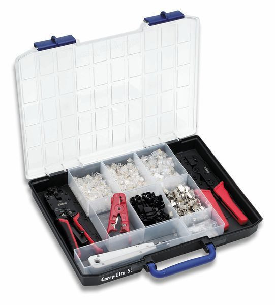 Servicecase Netzwerktechnik -raaco-Servicekasten CARRY-LITE 55- mit Inhalt: Abisolierer Data Strip (CIMCO-Artikelnr. 12 0092), Anlegewerkzeug Economy (CIMCO-Artikelnr. 11 8017), Crimpzange 4-, 6-, 8-polig ungeschirmt (CIMCO-Artikelnr. 10 6200), Crimpzange 8-polig geschirmt (CIMCO-Artikelnr10 6201), 100 Stck. Modularstecker 4-polig RJ 10 ungeschirmt CIMCO-Artikelnr. 18 3000), 100 Stck. Modularstecker 6-polig RJ 12 ungeschirmt (CIMCO-Artikelnr. 18 3004), 50 Stck. Modularstecker 8-polig RJ 45 ungeschirmt für flexible Leiter (Cimco-Artikelnr. 18 3008), 50 Stck.( Modularstecker 8-polig RJ 45 geschirmt (Cimco-Artikelnr. 18 3012), 25 Stck. Knickschutztüllen für Modularstecker schwarz (CIMCO-Artikelnr. 18 3020), 25 Stck. Knickschutztüllen für Modularstecker rot (Cimco-Artikelnr.18 3022). Größe: LxBxH 413x330x55 mm.