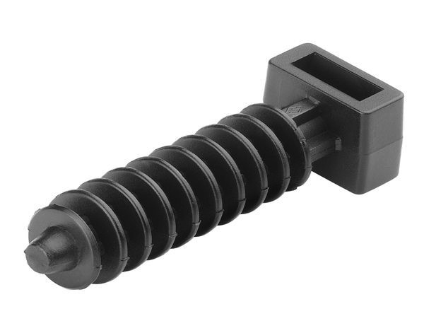 Montagedübel für Kabelbinder, Zapfenhalterung aus Nylon PA 6.6 für Wandbohrungen Ø 6 mm. Halogen- und silikonfrei. Für Kabelbinder bis 9 mm Breite. Selbstverlöschend, Brennbarkeitsklasse UL 94 HB. Temperaturbeständigkeit -40°C bis +85°C. Farbe: schwarz