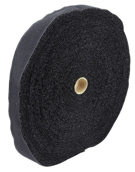 Klettband, aus schwarzem, extrudiertem Polyamid-Velours-Laminat, Dicke ca. 1, 4 mm, selbsthaftend back to back, geeignet für ca. 200 Betätigungen, außer der Standardfarbe schwarz ist lieferbar weiß, rot, blau, grün, gelb. Mindestabnahme bitte anfragen, Lieferzeit ca. 8 Wochen, Klettbinder-Rollenware, Rolle 25 m Länge für individuellen Zuschnitt auf gewünschte Länge