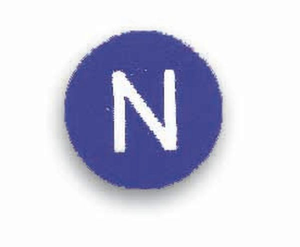 Leiterkennzeichnung, die selbstklebenden Folienzeichen zur Kennzeichnung von blanken und isolierten Leitern, Gehäusen, Schaltschränken und Geräten werden in verschiedenen Größen auf Karte zur schnellen Aufbringung geliefert. Die Zeichen entsprechen den Normen DIN40 009, DIN 40 011 und IEC. Material: Selbstklebende PVC-Folie mit Kaschierung, 0, 10 mm stark. Temperaturbeständig von -30°C bis +100°C, schmutzabweisend, dauerhafte Klebekraft. Ø-12,5 mm. Ausführung: Neutralleiter N, blau; Stück pro Bogen: 10; VE: 1.