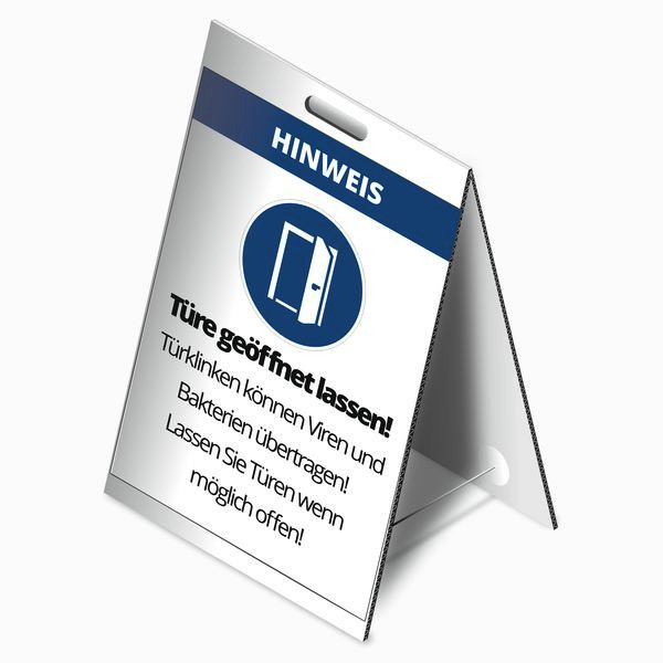 Dachaufsteller, ein stabiler Dachaufsteller, überall bequem und standsicher aufzustellen. Der Warnhinweis ist beidseitig aufgedruckt. Material: 100% recycelte Wellpappe. Ausführung: "Türe geöffnet lassen!"; Größe: 300x500x4 mm.
