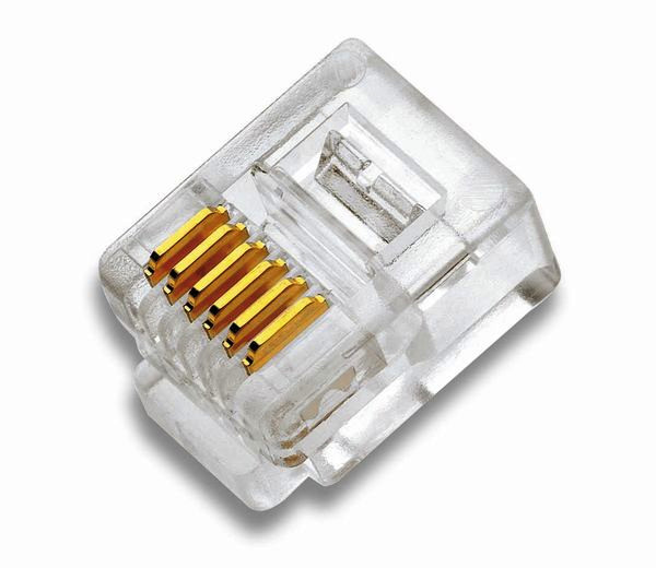 Modular-Stecker für Telekommunikation und Daten-Netzwerke, Qualitätsstecker für mindestens 500 Steckzyklen, Kontakte mit 50µ inch (1,27 Mikrometer) Goldauflage, Gehäuse aus flammhemmendem Polycarbonat, Zugbelastbarkeit Kabel zu Stecker mindestens 89 N. Ungeschirmte Modularstecker (mind. Cat. 3) geeignet für Flach- und Rundkabel. Ausführung: für flexible Leiter, Bezeichnung: RJ 12; AWG Bereich: 24-26; Anzahl der Positionen: 6; Anzahl der Kontakte: 6; VE/Stck.: 100
