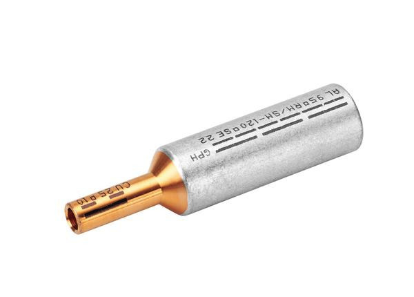 AL-CU-Pressverbinder aus E-Al und aus E-Cu gemäß EN 13600, blank. Für Verbindungen von CU-Kabel nach DIN 48201, ALU-Kabel nach DIN 48201, Teil 1 und ALU-Seilen DIN EN 50182. Ausführung: Querschnitt AL rm/sm: 95 mm²; Querschnitt AL se: 120 mm²; Querschn.: 25 mm²; Kennziffer AL: 22; Kennziffer CU: 10; AL: 13,2 mm; CU: 7 mm; Länge: 79 mm; Gewicht CU kg/100: 0,89; Gew. ges. kg/100: 6,3; Pressung- 7 mm: 3; Pressung- 5 mm: 6; VE/Stück.: 1.