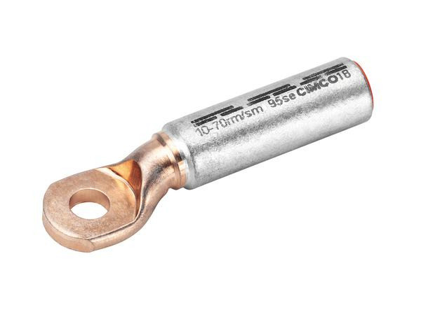 AL-CU-Presskabelschuhe aus E-Al und aus E-Cu gemäß EN 13600, blank, längsdicht mit massiver CU-Anschraublasche. Rohrabmessungen DIN 46329, mit Pressmarkierungen. Zum Verschrauben von ALU-Verbindungen auf CU-Schienen. Für zugentlastete Verbindungen von AL-Kabeln DIN 48201, Teil 1 und AL-Seilen DIN EN 50182. Für rundgedrückte Sektorleiter. 70 mm² - M10