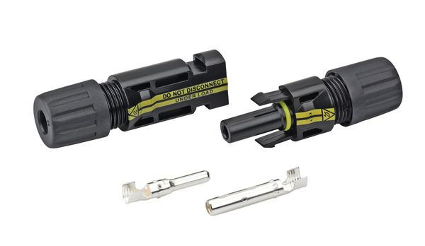 Photovoltaik-Steckverbinder-System. Der Einsatz dieses neuen Photovoltaik-Steckverbinders spart auf der Baustelle Arbeit und Zeit. Das Cimco-Steckverbinder-System ist kompatibel zu dem Marktstandard MC4 und ist passend für alle gängigen Solarkabel von 2,5 mm² bis 6 mm². Bestehend aus Verbindungssystem Stecker und Buchse inkl. Kunststoffgehäuse im Polybeutel und je 100 Stück Buchsen-Crimpkontakte sowie Kunststoffgehäuse im Polybeutel. Technische Daten: 2,5 bis 6 mm², Spannungsbereich: 1.000 V, Strombelastbarkeit: 30 A (4 mm², 6 mm²), Kontaktwiderstand des Verbindersystems: 5 m?, Durchmesser des Steckerkontaktes: 4 mm, Schutzklasse: IP 67, Temperaturbereich: -40°C/+85°C, Isolationsmaterial: PC/PA, Kontaktmaterial: Kupfer, versilbert, Sicherheitsklasse: II, Zertifizierung: TÜV, Crimpbereich: 2,5 - 6 mm². Ausführung: Set male + female; VE/Stck.: 1.