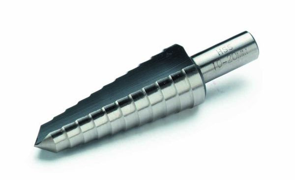 Stufenbohrer für den Maschinenbau und die Blechverarbeitung, aus HSS, mit 2 Schneiden, um 1 mm steigend. Ausführung: Bohrbereich-Ø: 12-20 mm; max. Bohrtiefe: 4 mm; Aufnahmeschaft-Ø: 9 mm. VE: 1.