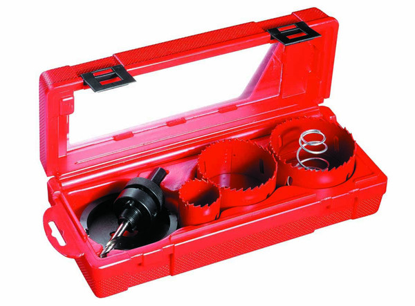 HSS-Bi-Metall Elektro-Top mit Randversenker, je eine Lochsäge 35 mm, 68 mm, 75 mm ø, Randversenker für 68 mm ø, mit zwei spezialgehärteten Schneidzähnen, Aufnahmeschaft mit zwei Mitnehmerstiften HSS-Führungsbohrer, 6,35 mm ø, Länge 70 mm, Ausdruckfeder (für alle Sägen ab 52 mm ø), ausführliche Bohranleitung, in schlagfester Kunststoffbox
