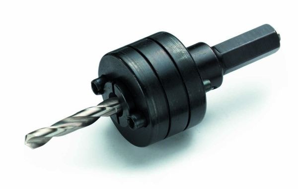 Aufnahmeschaft komplett mit Führungsbohrer Bestellnr. 207590 und Außengewinde, passend zu Lochsägen aus HSS-Bi-Metall 11 mm Sechskant, mit Mitnehmer und Innen Gegenmutter für Lochsägen 32 - 152 mm Durchmesser