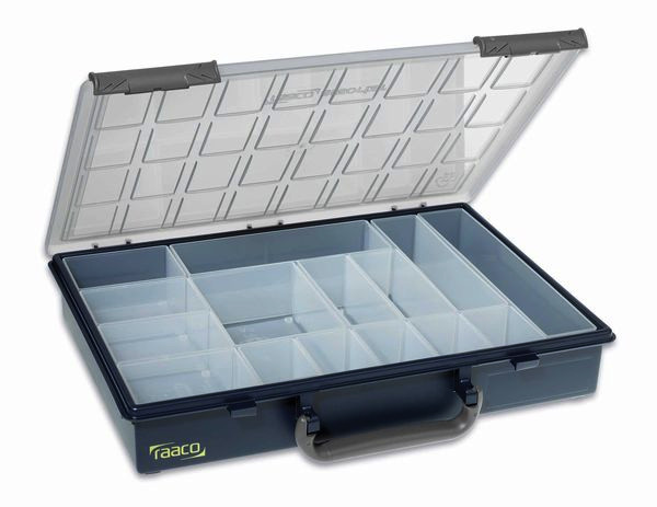 PSC Vario, Sortimentskästen inkl. Schiebeverschluss. Kann durch Einsätze Typ55 unterteilt werden. Typ vario-15; Kleingefache: 15; Gewicht: 0,90 kg; Maße: TxBxH 338x261x57 mm; Raster 4x8