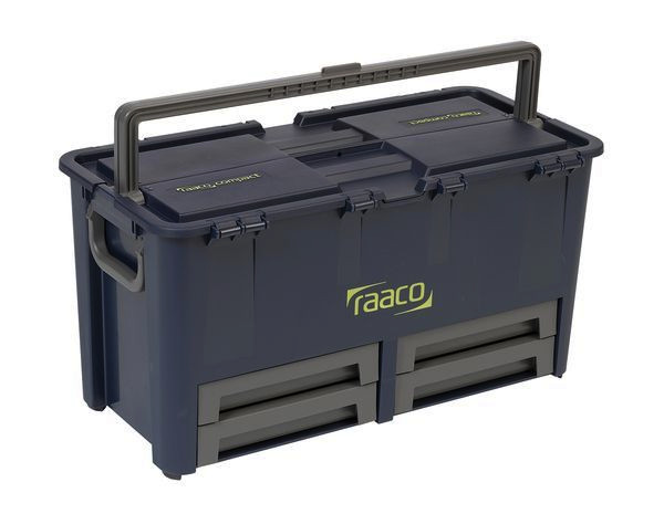 raaco Compact- der vielseitige Werkzeugkoffer für den Profi. Wohl durchdachte Gestaltung bis ins kleinste Detail hat in Kombination mit schlagfestem Kunststoff eine Serie robuster Werkzeugkoffer für alle Zwecke hervorgebracht – kompaktes Design mit hoher Flexibilität. Compact-Koffer haben ein geringes Eigengewicht, sind aber gleichzeitig sehr belastbar. Und sie nutzen nicht ab, rosten oder verbeulen nicht. Das verwendete Material ist langlebiges Polypropylen, das auch gegen die meisten Säuren und Chemikalien resistent ist. Den Compact gibt es in mehreren Varianten und Größen. Ganz gleich, für welche Variante Sie sich entscheiden – Sie erhalten immer ein preisgekröntes Design mit großer Haltbarkeit: Die Koffer wurden mit 6 internationalen Fachpreisen für Innovation, Design und Anwenderfreundlichkeit ausgezeichnet. COMPACT62, Werkzeugkoffer mit herausnehmbarem Werkzeugträger und 4 Schubladen für kleine Teile, inkl. 10 Einsätzen zur Unterteilung des Kofferinnenraums, Farbe: raaco blau; Tragvermögen: 50 kg; Gewicht: 6.457g; TxBxH 311x621x322 mm