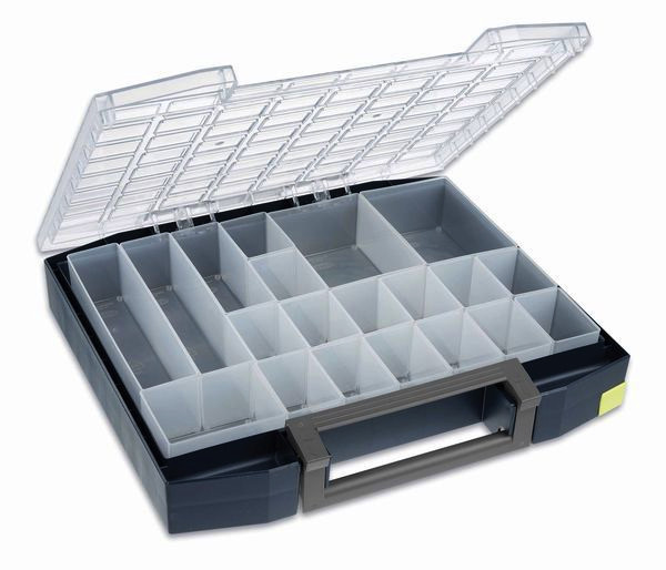 Die boxxser-Serie besteht aus 6 Koffervarianten in 2 unterschiedlichen Höhen, gefertigt aus stoßfestem und bruchsicherem Polycarbonat in einer Doppelwandkonstruktion, Profilraster in Deckel und Boden sichern den Kofferinhalt beim Transport, zwei feste Unterteilungen (neben dem Griff) bieten Raum für die Aufbewahrung von Kleinteilen oder Zubehör. Die integrierten Bodenprofilführungen schützen und sichern den Sortimentskoffer beim Stapeln. Griff mit integrierter Verriegelungssicherung verhindert das Öffnen des Koffers beim Tragen. inkl. 3 x Beschriftungsclips (rot, blau, gelb) , 8 x 8 Fächerraster, mit 20 Einsätzen