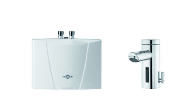 E-Kleindurchlauferhitzer, MBX7 Lumino, 6,5 kW, 400 V, elektronisch geregelt, im Set mit berührungsloser Sensorarmatur für energieeffizientes und hygienisches Händewaschen, Temperatureinstellung bis zu 42 Grad C am seitlichen Hebel der Armatur, Temperatura