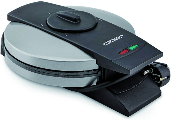 Waffeln 15,5 cm Ø, Antihaftbeschichtung, besonders zuckerresistent durch Zwei-Komponenten-Beschichtung, stufenlos wählbarer Bräunungsgrad, optische Fertigmeldung durch Backampel, innenliegendes Scharnier, flexibles Scharnier für ein besseres Aufgehen der Waffel, Fettauffangrille, Kabelaufwicklung mit Steckerdepot, platzsparende, auf den Griffen stehende Aufbewahrung