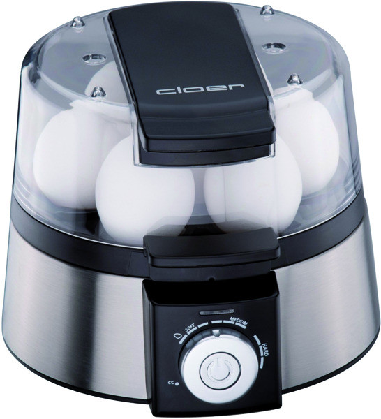 einstellbare Härtegrade: Soft/Medium/Hard, Weiterkochfunktion; Edelstahl Heizplatte, herausnehmbarer Eierträger, Einsatz für pochierte Eier, Messbecher mit Eierpick, Start/Stoppknopf, Kabelaufwicklung