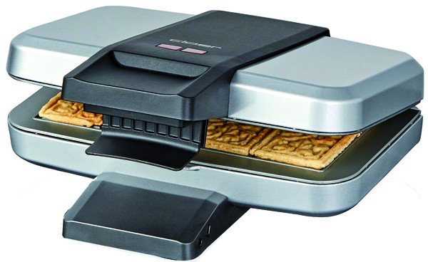 zum Backen von vier Spekulatiuskeksen, Keksgröße je 6 x 11 cm, Antihaftbeschichtung, 3-stufige Griffverriegelung, fest eingestellter Bräunungsgrad, optische Fertigmeldung durch Kontrolllampe, innenliegendes Scharnier, Kabelaufwicklung mit Steckerdepot, platzsparende, auf den Griffen stehende Aufbewahrung