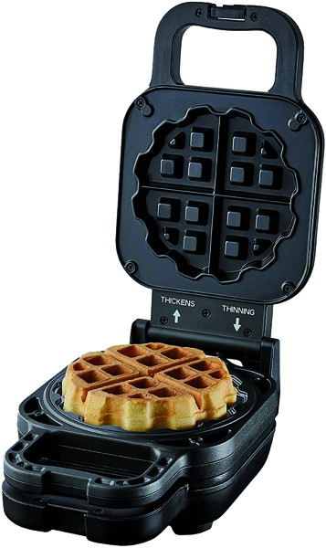 Waffelkaliber 11,5 cm Ø, 2,5 cm - 5,0 cm hohe Waffelkuchen - höhenverstellbar mit Abstandsring (herausnehmbar), Antihaftbeschichtung, fest eingestellter Bräunungsgrad, beidseitige Kontrollleuchte, Griffverriegelung, Sockel dient als Kabelumwicklung, platzsparende, auf den Füßen stehende Aufbewahrung
