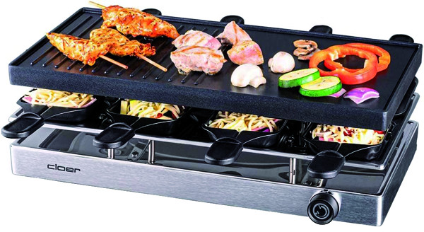 abnehmbare antihaftbeschichtete Aluminium-Druckgussplatte glatt/geriffelt 42 x 21 cm, antihaftbeschichtete Pfännchen mit wärmeisolierten Griffen, 8 Kunststoffspachtel, unbeheizter „Parkplatz“ für leere Pfännchen, Drehregler zur Temperaturkontrolle mit Kontrollleuchte