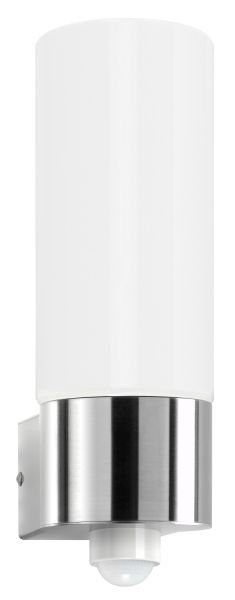 Edelstahl Wandleuchte, Opalglas weiß, Bewegungsmelder ca. 200°, Zeiteinstellung ca. 10 Sek. - 8 Min., Reichweite max. 8 m, ohne Leuchtmittel, 1x E27 max. 100 Watt, BxHXT 11x30x14 cm, IP44