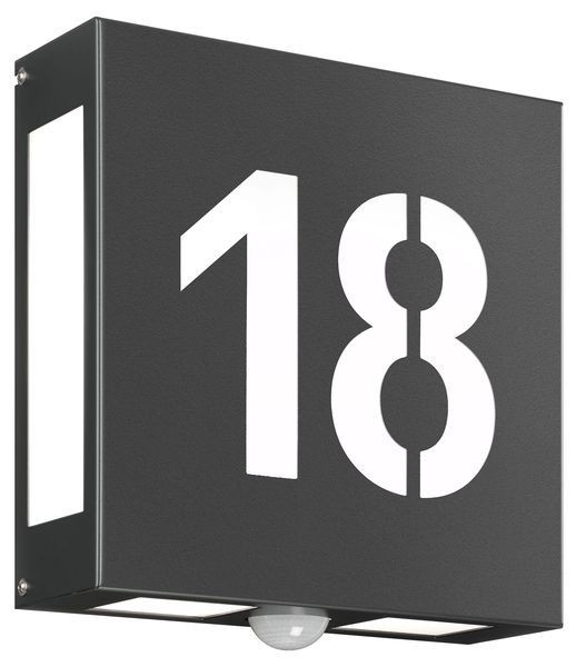Wandleuchte aus Edelstahl, pulverbeschichtet in Anthrazit, Diffusor aus Opalglas. Integrierter IR-Bewegungsmelder. Farbe Anthrazit, Material Edelstahl, Opalglas, Lichtquelle: 2 x E27, max. 60 Watt, 220-240 V, 50-60 Hz, IP44, Schutzklasse I, Maße: 280x280x95 mm