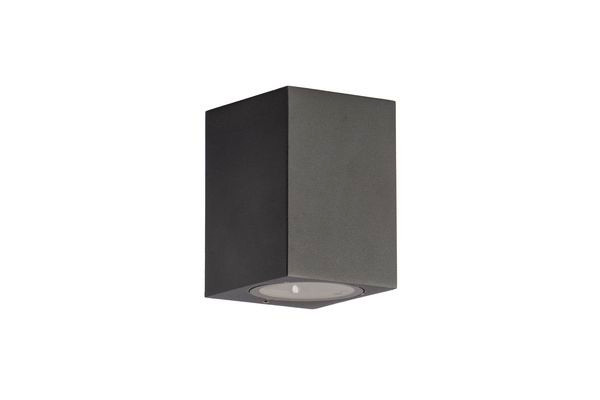 Wandleuchte aus Aluminium-Druckguss, Diffusor aus Klarglas. Farbe Anthrazit, Material Aluminium-Druckguss, Klarglas, Lichtquelle: 1 x GU10, max. 35 Watt, 220-240 V, 50-60 Hz, IP65, Schutzklasse I, Maße: 100x70x78mm
