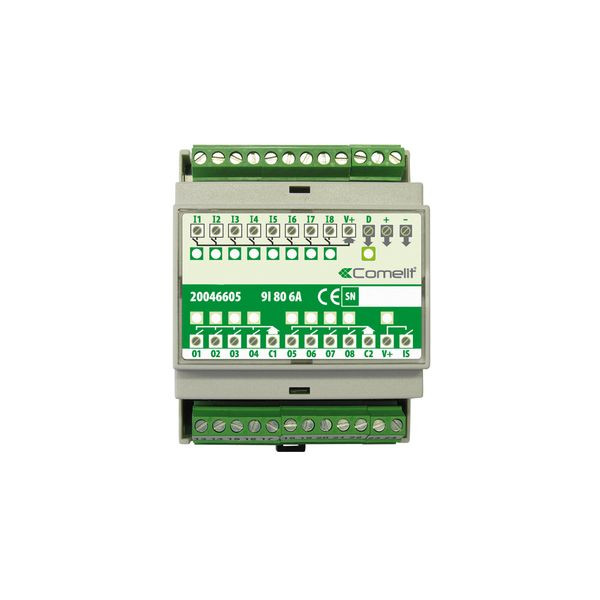 SimpleHome Modul mit 9 optisch gekoppelten Eingängen (8 normale + 1 Szenario), für den Anschluss von Tastern und 8 Relaisausgängen mit Schließer zur Steuerung von ohmschen elektrischen Lasten bis zu 6 A. Nicht geeignet für die Steuerung von Leuchtstoffröhren, LED-Leuchten, Energiesparlampen oder hohen Lasten. Abmessungen: 71x90x58 mm (4 DIN-Module). Stromverbrauch: < 167 mA.