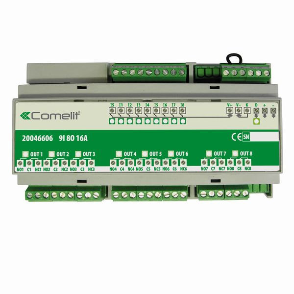 SimpleHome Modul mit 9 optisch gekoppelten Eingängen (8 normale + 1 Szenario), für den Anschluss von Tastern und 8 Relaisausgängen mit Öffner/Schließer-Schaltkontakt zur Steuerung von ohmschen elektrischen Lasten bis zu 16A. Abmessungen: 160x90x58 mm (9 DIN-Module). Stromverbrauch: < 220 mA.