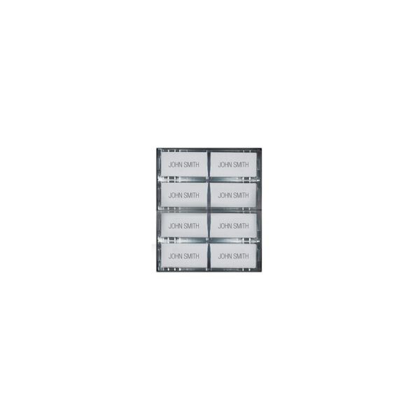 Tastenabdeckung, Türstation Ciao, 8 Klingeltasten. Zur Erweiterung des Basismodul Ciao Art. CA2100P oder des Tastenmodul Ciao Art. CA2200P. Art. CA9212 besteht aus vier Klingeltasten welche mittig mit einem Steg geteilt sind und eine Beschriftung rechts und links vom Steg ermöglichen. Pro Tastenmodul Art. CA2200P werden 2 Stk. Art. CA9212 benötigt.