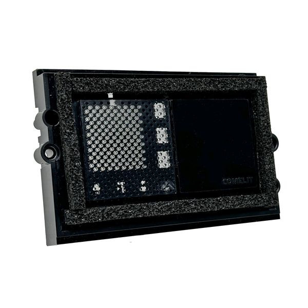 Einbauhalter Serie Ultra für Audio-Systeme als Universalhalter zum Einbau und zur Verwendung der Lautsprechereinheit Art. EU1010, Art. 1010VC, Art. 2010, Art. 2010VC, Art. 8010 inkl. Handicap Funktion nach DIN18040 an vorhandene Türstationen sowie Briefkastenanlagen. Der bauseitig oder durch den Briefkastenhersteller erstellte Ausschnitt sowie die Bolzen zur Befestigung des Art. EU1250A sind gemäß Comelit Zeichnung zu erstellen. Der Einbauhalter EU1250A ist ausgestattet mit einem Audio-Sprechgitter zur Verwendung einer Audio-Einheit. Beleuchtung der Namensschilder ist bauseits, unabhängig von der Spannungsversorgung der Sprechanlage, vorzunehmen.
