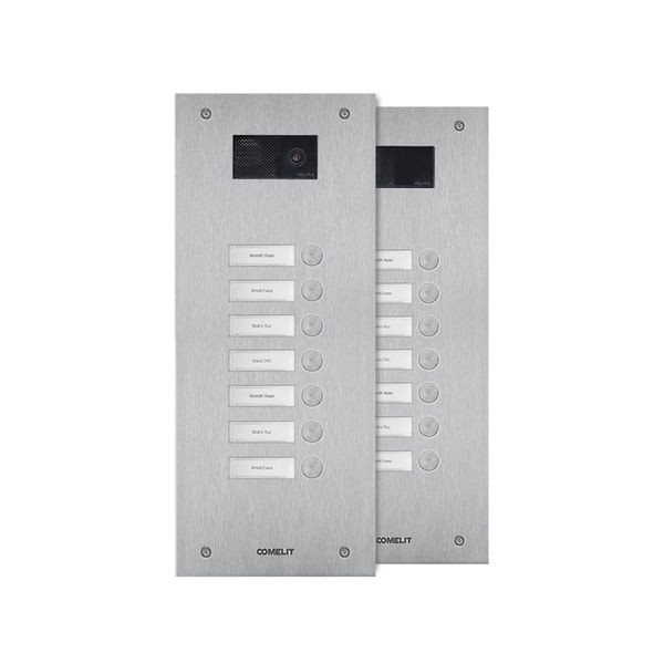 Frontplatte Serie Steel-Switch, 7 Teilnehmer, 1-reihig, universell. Zu vervollständigen mit dem UP-Gehäuse IX9151 oder AP-Gehäuse IX9161 sowie mit dem Lautsprecher Audio oder Audio-Video (Systemabhängig) der Ultra Serie EUxxxx. Die Lautsprecherhalter EU1250A und EU1250V sind enthalten. Frontplatte aus 2,5mm starker Edelstahlplatte V4A und sieben flächenbündig integrierten Klingeltasten. Namensschilder von vorne zu wechseln, inkl. rückseitiger LED-Beleuchtung. Integriertes Ausstattungsmerkmal ist die Handicap-Funktion nach DIN 18040 mit Zustandsanzeige Türruf, Gesprächsbereit, Türöffnerfunktion und Teilnehmererreichbarkeit visuell mit LED´s hinter genormten Handicap Symbolen sowie akustischer Sprachausgabe der Zustände. Schlagfestigkeit: IK08. Abmessungen: 369,1x150x2,5mm.