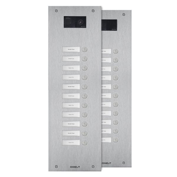 Frontplatte Serie Steel-Switch, 11 Teilnehmer, 1-reihig, universell. Zu vervollständigen mit dem UP-Gehäuse IX9152 oder AP-Gehäuse IX9162 sowie mit dem Lautsprecher Audio oder Audio-Video (Systemabhängig) der Ultra Serie EUxxxx. Die Lautsprecherhalter EU1250A und EU1250V sind enthalten. Frontplatte aus 2,5mm starker Edelstahlplatte V4A und elf flächenbündig integrierten Klingeltasten. Namensschilder von vorne zu wechseln, inkl. rückseitiger LED-Beleuchtung. Integriertes Ausstattungsmerkmal ist die Handicap-Funktion nach DIN 18040 mit Zustandsanzeige Türruf, Gesprächsbereit, Türöffnerfunktion und Teilnehmererreichbarkeit visuell mit LED´s hinter genormten Handicap Symbolen sowie akustischer Sprachausgabe der Zustände. Schlagfestigkeit: IK08. Abmessungen: 475,5x150x2,5mm.