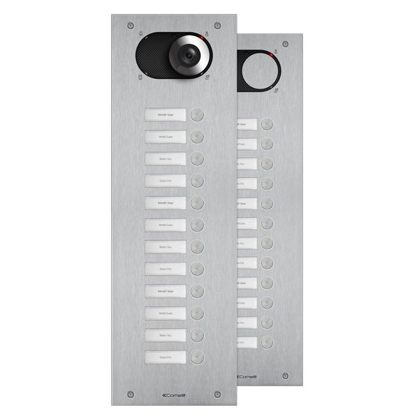 Frontplatte Serie Switch, 12 Teilnehmer, 1-reihig, SB2, VIP. Zu vervollständigen mit dem UP-Gehäuse IX9152 oder AP-Gehäuse IX9162 sowie mit dem Lautsprecher Audio oder Video (Systemabhängig) Art. 1621, 1621VC, 1682, 4680C, 4681 oder 4682HD. Frontplatte aus 2,5mm starker Edelstahlplatte V4A und zwölf flächenbündig integrierten Klingeltasten. Namensschilder von vorne zu wechseln, inkl. rückseitiger LED-Beleuchtung. Integriertes Ausstattungsmerkmal ist die Handicap-Funktion nach DIN 18040 mit Zustandsanzeige Türruf, Gesprächsbereit, Türöffnerfunktion und Teilnehmererreichbarkeit visuell mit LED´s hinter genormten Handicap Symbolen sowie akustischer Sprachausgabe der Zustände. Zu verwenden mit Netzgerät Art. 1210. Schlagfestigkeit: IK08. Abmessungen: 475,5x150x2,5mm.