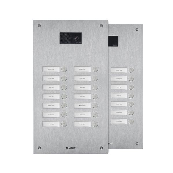 Frontplatte Serie Steel-Switch, 14 Teilnehmer, 2-reihig, universell. Zu vervollständigen mit dem UP-Gehäuse IX9153 oder AP-Gehäuse IX9163 sowie mit dem Lautsprecher Audio oder Audio-Video (Systemabhängig) der Ultra Serie EUxxxx. Die Lautsprecherhalter EU1250A und EU1250V sind enthalten. Frontplatte aus 2,5mm starker Edelstahlplatte V4A und vierzehn flächenbündig integrierten Klingeltasten. Namensschilder von vorne zu wechseln, inkl. rückseitiger LED-Beleuchtung. Integriertes Ausstattungsmerkmal ist die Handicap-Funktion nach DIN 18040 mit Zustandsanzeige Türruf, Gesprächsbereit, Türöffnerfunktion und Teilnehmererreichbarkeit visuell mit LED´s hinter genormten Handicap Symbolen sowie akustischer Sprachausgabe der Zustände. Schlagfestigkeit: IK08. Abmessungen: 395,7x216,4x2,5mm.