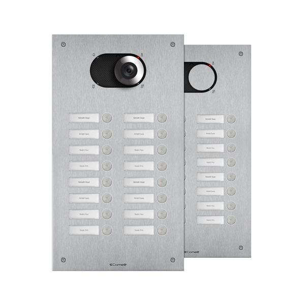 Frontplatte Serie Switch, 16 Teilnehmer, 2-reihig, SB2, VIP. Zu vervollständigen mit dem UP-Gehäuse IX9153 oder AP-Gehäuse IX9163 sowie mit dem Lautsprecher Audio oder Video (Systemabhängig) Art. 1621, 1621VC, 1682, 4680C, 4681 oder 4682HD. Frontplatte aus 2,5mm starker Edelstahlplatte V4A und sechzehn flächenbündig integrierten Klingeltasten. Namensschilder von vorne zu wechseln, inkl. rückseitiger LED-Beleuchtung. Integriertes Ausstattungsmerkmal ist die Handicap-Funktion nach DIN 18040 mit Zustandsanzeige Türruf, Gesprächsbereit, Türöffnerfunktion und Teilnehmererreichbarkeit visuell mit LED´s hinter genormten Handicap Symbolen sowie akustischer Sprachausgabe der Zustände. Zu verwenden mit Netzgerät Art. 1210. Schlagfestigkeit: IK08. Abmessungen: 395,7x216,4x2,5mm.