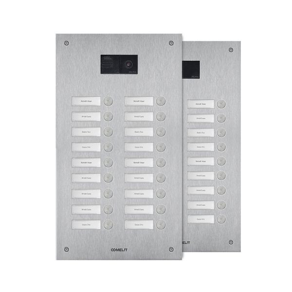 Frontplatte Serie Steel-Switch, 18 Teilnehmer, 2-reihig, universell. Zu vervollständigen mit dem UP-Gehäuse IX9153 oder AP-Gehäuse IX9163 sowie mit dem Lautsprecher Audio oder Audio-Video (Systemabhängig) der Ultra Serie EUxxxx. Die Lautsprecherhalter EU1250A und EU1250V sind enthalten. Frontplatte aus 2,5mm starker Edelstahlplatte V4A und achtzehn flächenbündig integrierten Klingeltasten. Namensschilder von vorne zu wechseln, inkl. rückseitiger LED-Beleuchtung. Integriertes Ausstattungsmerkmal ist die Handicap-Funktion nach DIN 18040 mit Zustandsanzeige Türruf, Gesprächsbereit, Türöffnerfunktion und Teilnehmererreichbarkeit visuell mit LED´s hinter genormten Handicap Symbolen sowie akustischer Sprachausgabe der Zustände. Schlagfestigkeit: IK08. Abmessungen: 395,7x216,4x2,5mm.