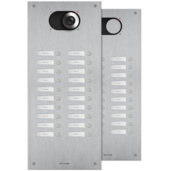 Frontplatte Serie Switch, 20 Teilnehmer, 2-reihig, SB2, VIP. Zu vervollständigen mit dem UP-Gehäuse IX9154 oder AP-Gehäuse IX9164 sowie mit dem Lautsprecher Audio oder Video (Systemabhängig) Art. 1621, 1621VC, 1682, 4680C, 4681 oder 4682HD. Frontplatte aus 2,5mm starker Edelstahlplatte V4A und zwanzig flächenbündig integrierten Klingeltasten. Namensschilder von vorne zu wechseln, inkl. rückseitiger LED-Beleuchtung. Integriertes Ausstattungsmerkmal ist die Handicap-Funktion nach DIN 18040 mit Zustandsanzeige Türruf, Gesprächsbereit, Türöffnerfunktion und Teilnehmererreichbarkeit visuell mit LED´s hinter genormten Handicap Symbolen sowie akustischer Sprachausgabe der Zustände. Zu verwenden mit Netzgerät Art. 1210. Schlagfestigkeit: IK08. Abmessungen: 502,1x216,4x2,5mm.