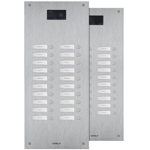Frontplatte Serie Steel-Switch, 20 Teilnehmer, 2-reihig, universell. Zu vervollständigen mit dem UP-Gehäuse IX9154 oder AP-Gehäuse IX9164 sowie mit dem Lautsprecher Audio oder Audio-Video (Systemabhängig) der Ultra Serie EUxxxx. Die Lautsprecherhalter EU1250A und EU1250V sind enthalten. Frontplatte aus 2,5mm starker Edelstahlplatte V4A und zwanzig flächenbündig integrierten Klingeltasten. Namensschilder von vorne zu wechseln, inkl. rückseitiger LED-Beleuchtung. Integriertes Ausstattungsmerkmal ist die Handicap-Funktion nach DIN 18040 mit Zustandsanzeige Türruf, Gesprächsbereit, Türöffnerfunktion und Teilnehmererreichbarkeit visuell mit LED´s hinter genormten Handicap Symbolen sowie akustischer Sprachausgabe der Zustände. Schlagfestigkeit: IK08. Abmessungen: 502,1x216,4x2,5mm.