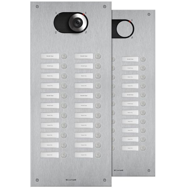 Frontplatte Serie Switch, 22 Teilnehmer, 2-reihig, SB2, VIP. Zu vervollständigen mit dem UP-Gehäuse IX9154 oder AP-Gehäuse IX9164 sowie mit dem Lautsprecher Audio oder Video (Systemabhängig) Art. 1621, 1621VC, 1682, 4680C, 4681 oder 4682HD. Frontplatte aus 2,5mm starker Edelstahlplatte V4A und zweiundzwanzig flächenbündig integrierten Klingeltasten. Namensschilder von vorne zu wechseln, inkl. rückseitiger LED-Beleuchtung. Integriertes Ausstattungsmerkmal ist die Handicap-Funktion nach DIN 18040 mit Zustandsanzeige Türruf, Gesprächsbereit, Türöffnerfunktion und Teilnehmererreichbarkeit visuell mit LED´s hinter genormten Handicap Symbolen sowie akustischer Sprachausgabe der Zustände. Zu verwenden mit Netzgerät Art. 1210. Schlagfestigkeit: IK08. Abmessungen: 502,1x216,4x2,5mm.