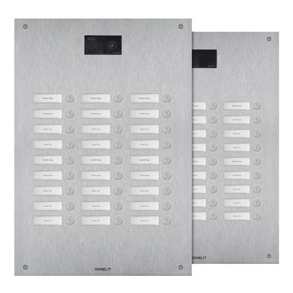 Frontplatte Serie Steel-Switch, 27 Teilnehmer, 3-reihig, universell. Zu vervollständigen mit dem UP-Gehäuse IX9155 oder AP-Gehäuse IX9165 sowie mit dem Lautsprecher Audio oder Audio-Video (Systemabhängig) der Ultra Serie EUxxxx. Die Lautsprecherhalter EU1250A und EU1250V sind enthalten. Frontplatte aus 2,5mm starker Edelstahlplatte V4A und siebenundzwanzig flächenbündig integrierten Klingeltasten. Namensschilder von vorne zu wechseln, inkl. rückseitiger LED-Beleuchtung. Integriertes Ausstattungsmerkmal ist die Handicap-Funktion nach DIN 18040 mit Zustandsanzeige Türruf, Gesprächsbereit, Türöffnerfunktion und Teilnehmererreichbarkeit visuell mit LED´s hinter genormten Handicap Symbolen sowie akustischer Sprachausgabe der Zustände. Schlagfestigkeit: IK08. Abmessungen: 448,9x302,9x2,5mm.